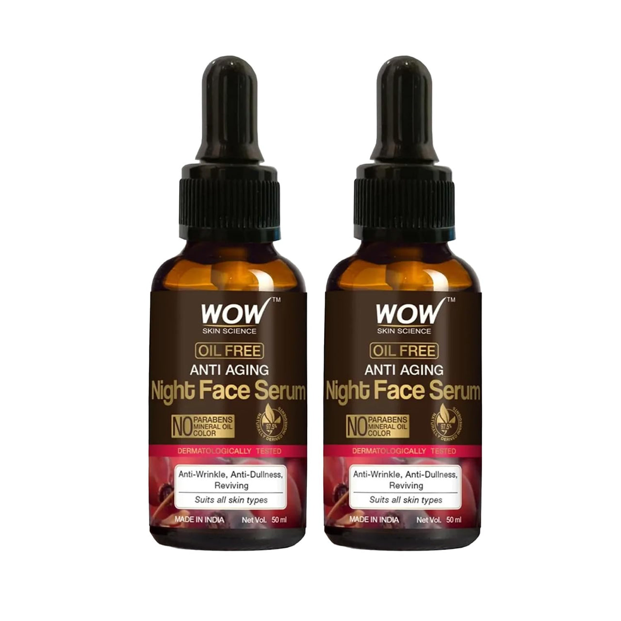 Details: Help restore youthful suppleness and radiance to dull, aging with WOW Skin Science anti aging night face serum. An anti-wrinkle, anti dullness, reviving serum that supports your skin’s natural renewal process during the night. It is a lightweight serum that gets easily absorbed into the skin. The night serum helps to nourish and moisturize your dry, tired skin. It helps to smooth out fine lines and reduce spots. The serum supports in clarifying skin tone and refining the texture. It helps to even out patchy complexion and give it a natural radiance. It is infused with rosehip oil, hyaluronic acid, avocado oil, and vitamin B3 and pro-vitamin B5. Rosehip oil rich in essential fatty acids, vitamins and minerals that supports skin’s repair process. Hyaluronic acid, a natural moisturizer that protects skin’s moisture barrier and strengthens collagen structure. Avocado oil rich in vitamin e and essential fatty acids supports in nourishing and restoring glow to the skin. Vitamin B3 & pro-vitamin B5, potent skin nourishers of the vitamin b group that repair and restore skin’s cellular structure make skin supple and soft to the touch. Help revive your dull, patchy, tired-looking skin with WOW Skin Science anti-aging night face serum. Infused with rosehip oil and other natural actives this serum helps to fade pigmentation, fight signs of aging brought on by free radicals, brighten and nourish skin.